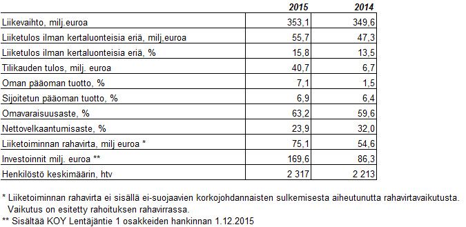 • Konsernin liiketulos ilman kertaluonteisia eriä vahvistui ja oli 55,7 miljoonaa euroa (47,3). Liiketulos ilman kertaluonteisia eriä oli 15,8 prosenttia liikevaihdosta (13,5).